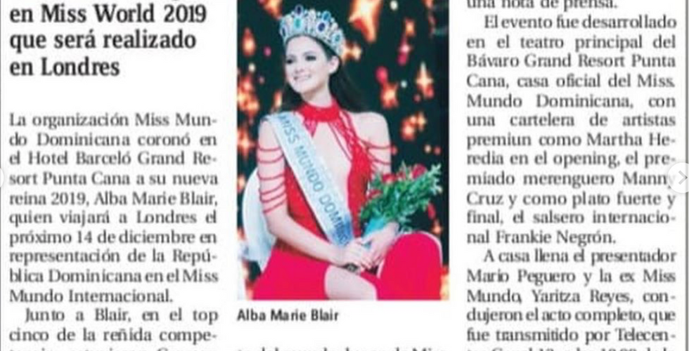 Nuestra modelo desde los 12 años Alba Blair, fue coronada como Miss Mundo Dominicana representando su ciudad natal Jarabacoa. Quién partirá el 14 de diciembre del 2019 a la ciudad de Londres en busca de La Corona internacional.